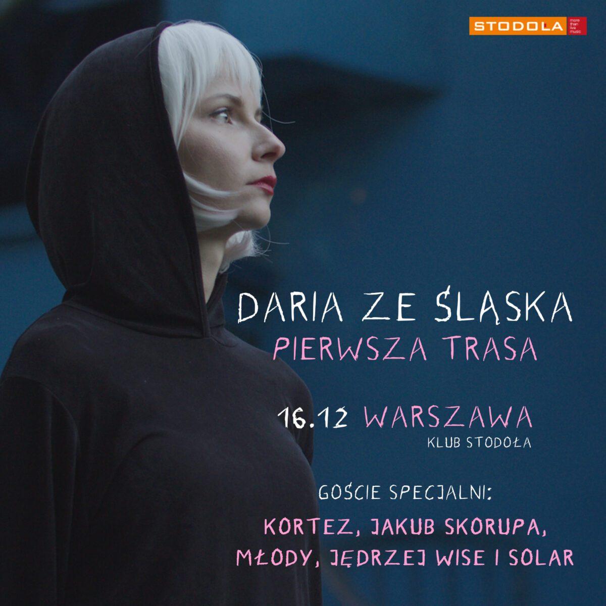 Już 16 grudnia Daria ze Śląska zagra w warszawskiej Stodole finałowy koncert trwającej Pierwszej Trasy. Artystka na żywo wykona materiał z debiutanckiej płyty “Daria ze Śląska tu była” oraz nowe numery, które pojawią się na planowanej na wiosnę EPce. Na scenie pojawią się wyjątkowi dla Darii goście: Kortez, Jakub Skorupa, Młody, Jędrzej Wise i Solar.