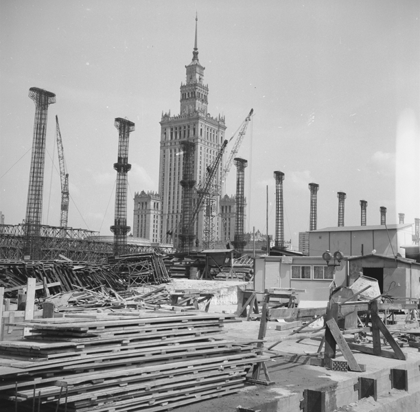 Budowę obecnego Dworca Centralnego włączono do priorytetów inwestycyjnych państwa na lata 1971–1975. Na archiwalnych fotografiach pokazano imponującą skalę tego przedsięwzięcia: montaż podpór dachu hali głównej, szkielety konstrukcji wznoszące się ponad Alejami Jerozolimskimi, robotników i inżynierów pracujących przy nieprzerwanym ruchu kolejowym, a w tle – budynek tymczasowego dworca. W dokumentach technicznych Archiwa Państwowe odnalazły liczby, które dobrze oddają rozmachem epoki: 12,5 tysiąca ton stali, 100 tysięcy metrów sześciennych betonu, 80 tysięcy metrów kwadratowych szkła, 50 tysięcy metrów kwadratowych kamienia, w tym dolnośląskie marmury i granity. Widzimy też ślady decyzji o sprowadzeniu z krajów zachodnich nowoczesnych elementów wyposażenia – elektronicznych zegarów, schodów ruchomych, automatycznych drzwi.