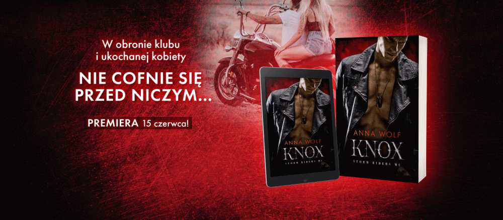 Akcja pełna nieprzewidzianych zwrotów, dynamiczne tempo i niepohamowana namiętność, której nie sposób się oprzeć. Powieść „Knox” jest kontynuacją serii „Storm Riders MC” przedstawiającej przygody członków klubu motocyklowego znanych z kart „Blade’a” i „Storma”. Anna Wolf zabiera czytelniczki do niebezpiecznego, owianego tajemnicą świata, który rządzi się własnymi prawami. Każda z wchodzących w skład tej serii książek to porywająca opowieść o mężczyznach w skórach i na lśniących motocyklach, którzy, choć na co dzień są twardzielami, to pod wpływem miłości do ukochanej kobiety potrafią stać się czuli i troskliwi.
