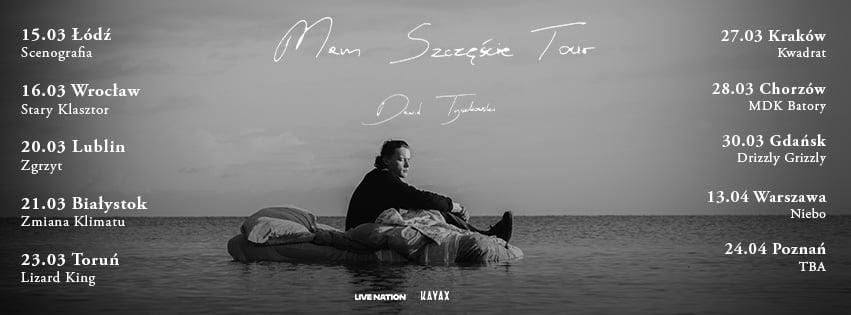 Chwile po premierze albumu, Dawid Tyszkowski wyruszy w wyjątkową trasę koncertową. Razem z zespołem zagra w 10 polskich miastach i zaprezentuje płytę “Mam szczęście” w wersji live. Bilety są już dostępne