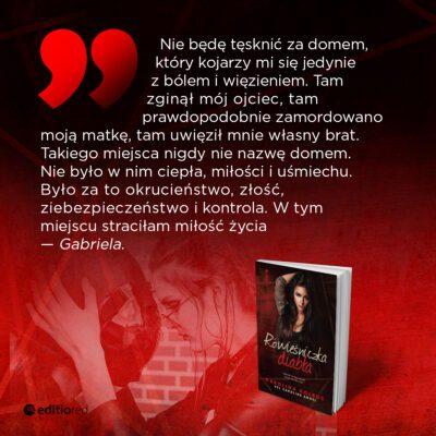Mamy ciekawe środowisko gangów, ciekawe postacie, porywającą fabułę i piękny wątek miłości dwojga młodych ludzi. Czego więcej nam trzeba do krótkiej ale wciągającej powieści? Autorka swietnie zobrazowała ponury, okrutny klimat świata gangów przepełniony przemocą i tajemnicami. Śmiało mogę powiedzieć, że wcale nie miałabym nic przeciwko aby historia Mae i Gabriela została rozwinięta do tomu drugiego.