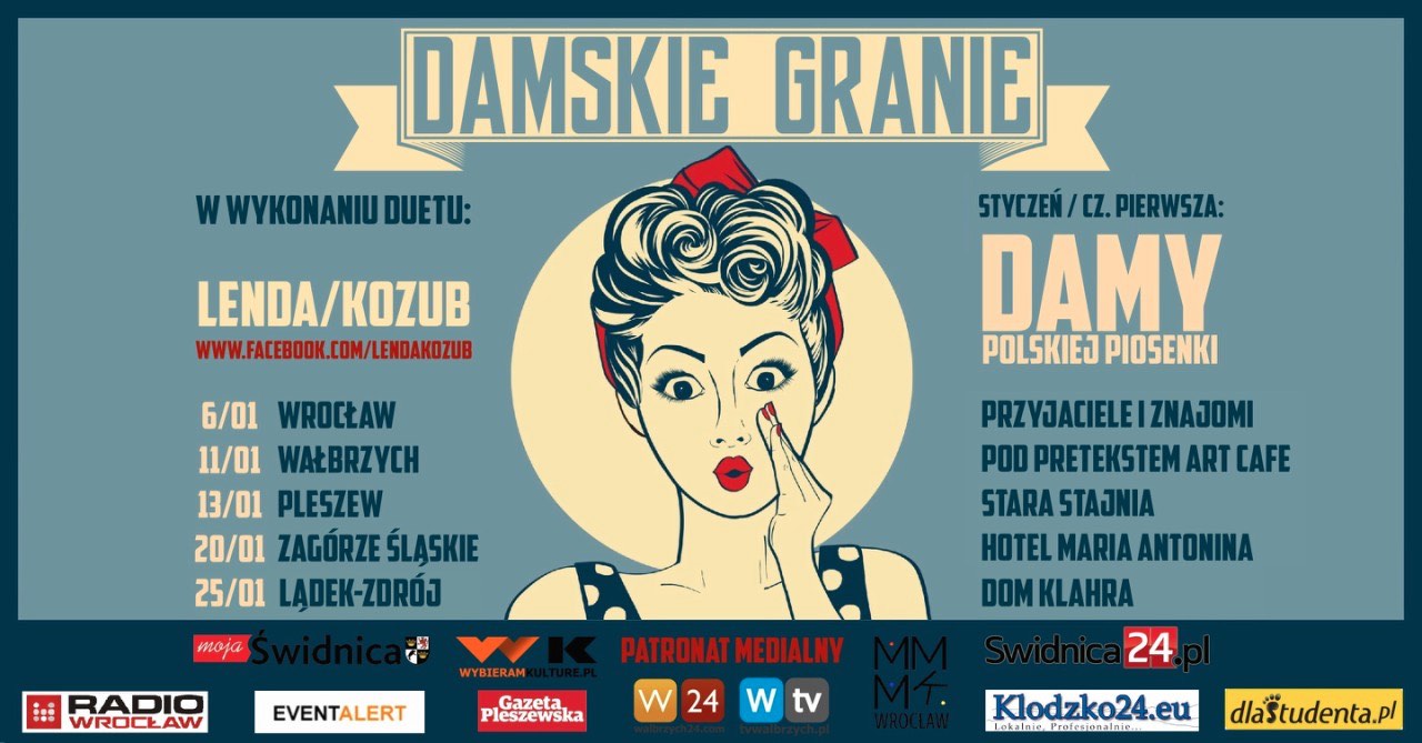 Koncerty w hołdzie kobietom, które na stałe zapisały się w pamięci publiczności i historii muzyki. „Damskie Granie” w wykonaniu duetu LENDA / KOZUB będzie serią koncertów w trzech częściach, poświęconych największym kobiecym głosom i osobowościom. Tego wieczoru, podczas pierwszej – styczniowej – odsłony, przypomnimy sobie „Damy Polskiej Piosenki” takie, jak: Kasia Nosowska, Edyta Górniak, Edyta Bartosiewicz, Anna Maria Jopek, Kayah, Grażyna Łobaszewska, Krystyna Prońko, Edyta Geppert, Renata Przemyk, Maryla Rodowicz.