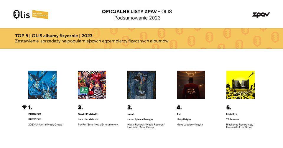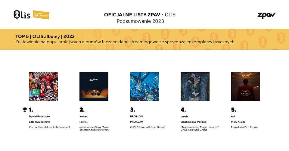 Najbardziej kompleksowe zestawienie, łączące sprzedaż fizyczną i cyfrową albumów muzycznych, otwiera płyta Lata dwudzieste Dawid Podsiadły, która miała swoją premierę w październiku 2022 r. Na miejscu drugim uplasował się Kuban z albumem spokój. Płyta ukazała się na rynku 24 marca 2023 r., debiutując na pierwszym miejscu cotygodniowej listy OLiS Albumy. PROXL3M – czwarty studyjny album duetu PRO8L3M, który miał swoją premierę 1 grudnia 2023 r., zamyka podium zestawienia. Do pierwszej piątki trafiła jeszcze sanah z płytą sanah śpiewa Poezyje oraz Avi z wydawnictwem Mały Książę.