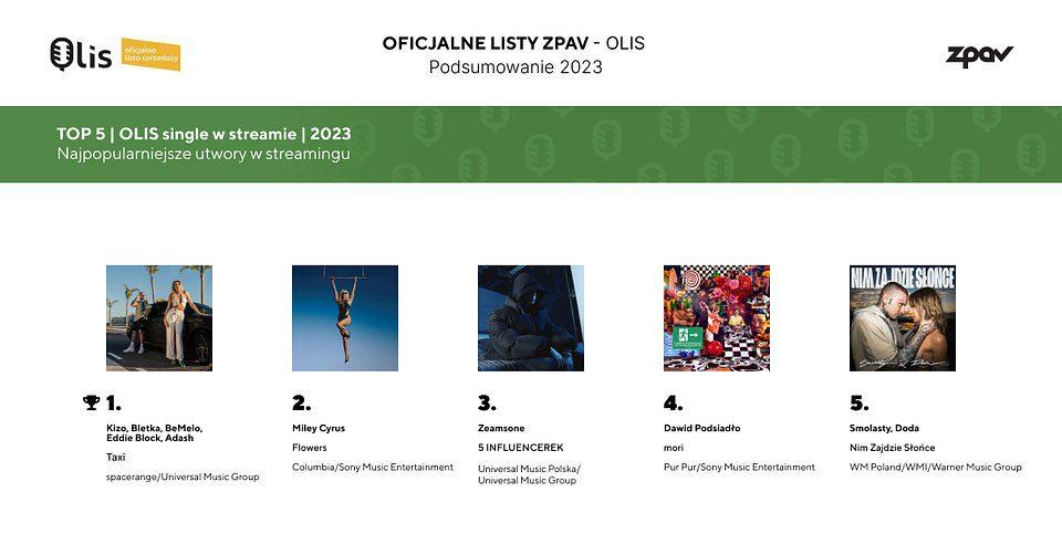 Związek Producentów Audio Video przygotował roczne podsumowanie Oficjalnych List Sprzedaży OLiS. Polscy artyści dominują w ścisłym topie zestawień, a niekwestionowanym liderem jest Dawid Podsiadło. Jego produkcje trafiły do pierwszej piątki każdej listy, zaś album Lata dwudzieste zajmuje pierwsze miejsce zarówno w podsumowaniu albumów w serwisach streamingowych, jak i zestawieniu łączącym wyniki w streamingu ze sprzedażą fizyczną.