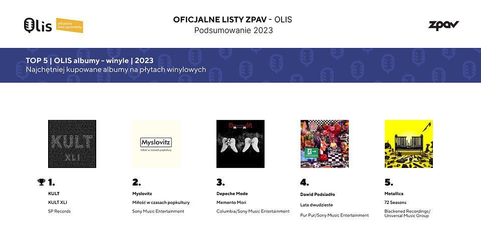 Najchętniej kupowanym winylem w roku 2023 był box zespołu Kult, przygotowany z okazji 41-lecia istnienia zespołu – XLI. Na miejscu drugim uplasował się album nagrany w 1999 r. przez zespół Myslovitz – Miłość w czasach popkultury. Miejsce trzecie rocznego zestawienia najpopularniejszych płyt winylowych należy do najnowszego wydawnictwa grupy Depeche Mode, zatytułowanego Memento Mori. Tuż za pierwszą trójką uplasował się Dawid Podsiadło z albumem Lata dwudzieste. Miejsce piąte, podobnie jak w przypadku listy prezentującej łączną sprzedaż fizyczną, zajmuje zespół Metallica i album 72 Seasons.