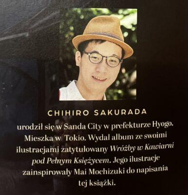 Grafika na tyle zauroczyła autorkę, iż ta stwierdziła, że jeśli faktycznie doszłoby do napisania przez nią książki, to ilustratorem musi być właśnie ten człowiek. Wiosną 2019 roku doszło do spotkania autorki z ilustratorem, na którym to wyznała mu, że chciałaby z nim współpracować. Chihiro zgodził się i tym samym powstała książka “Kawiarnia pod pełnym księżycem”.
