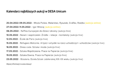 Aukcji towarzyszy wystawa w siedzibie DESA Unicum przy ul. Pięknej 1A dostępna od 6 do 16 maja w godz. 11-19 (poniedziałek-piątek) i 11-16 (sobota). Wstęp na ekspozycję jest bezpłatny.